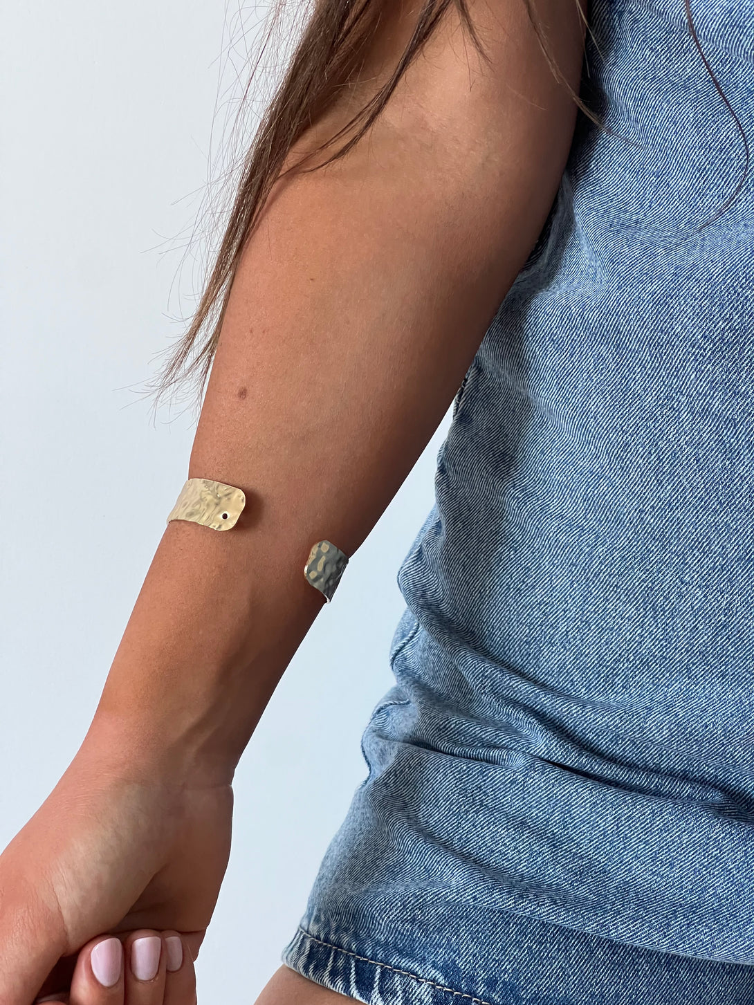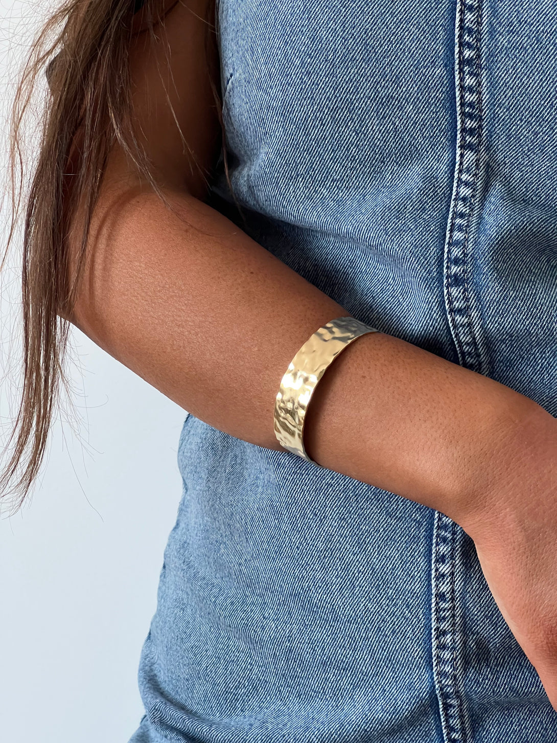 Brățara Golden Dune atrage toate privirile prin textura sa ciocănită și finisajul auriu intens. Inspirată de formele fluide ale naturii, această brățară este confecționată din oțel inoxidabil placat, fiind hipoalergenică, rezistentă la apă și nu își schimbă culoarea în timp.