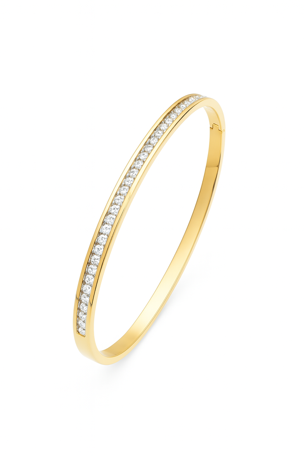 Bratara Classique imbina rafinamentul cu simplitatea. Realizata din otel inoxidabil placat cu aur, este decorata cu un rand continuu de zirconii albe fine, oferind un aspect luxuriant, dar discret.