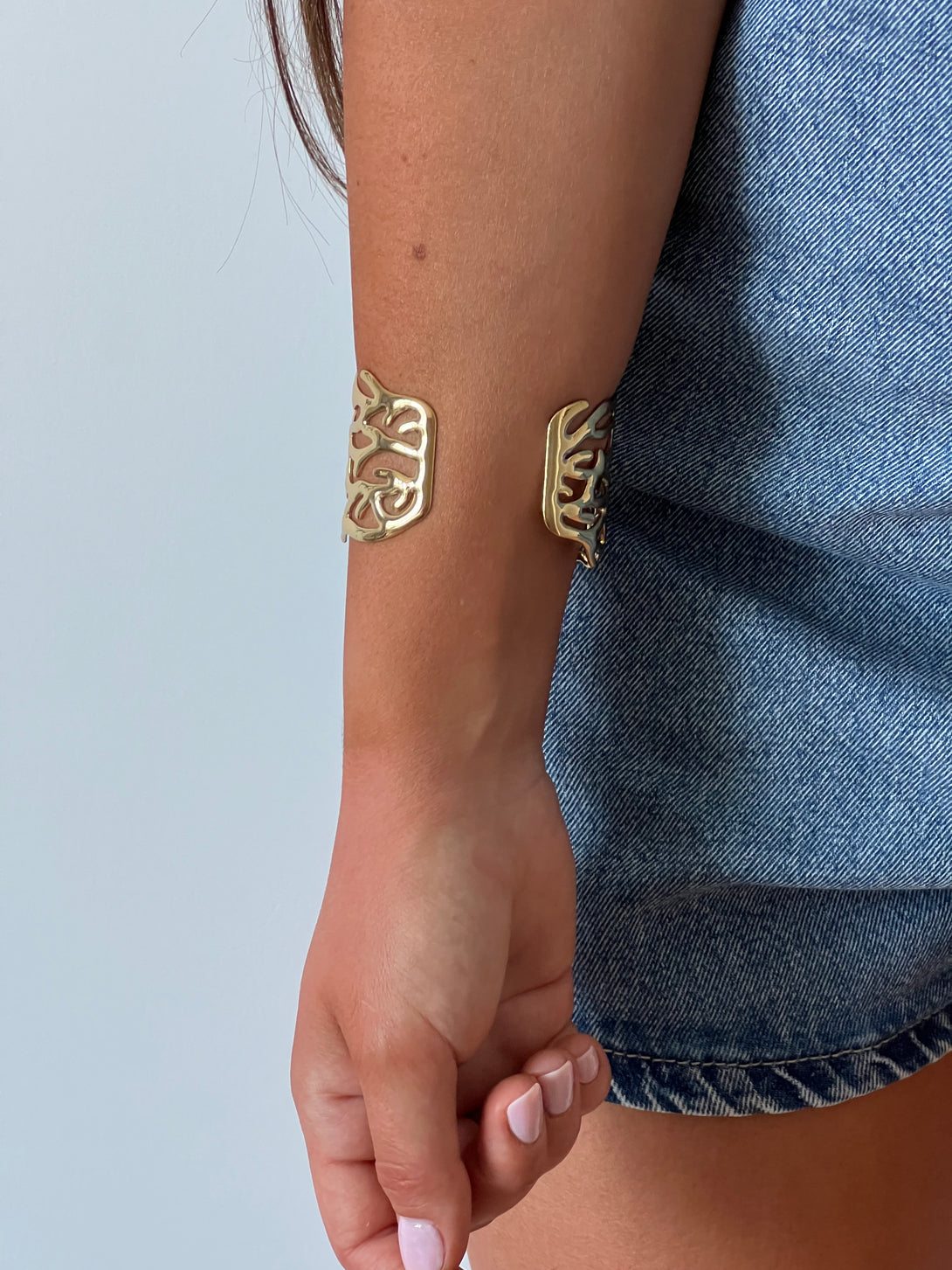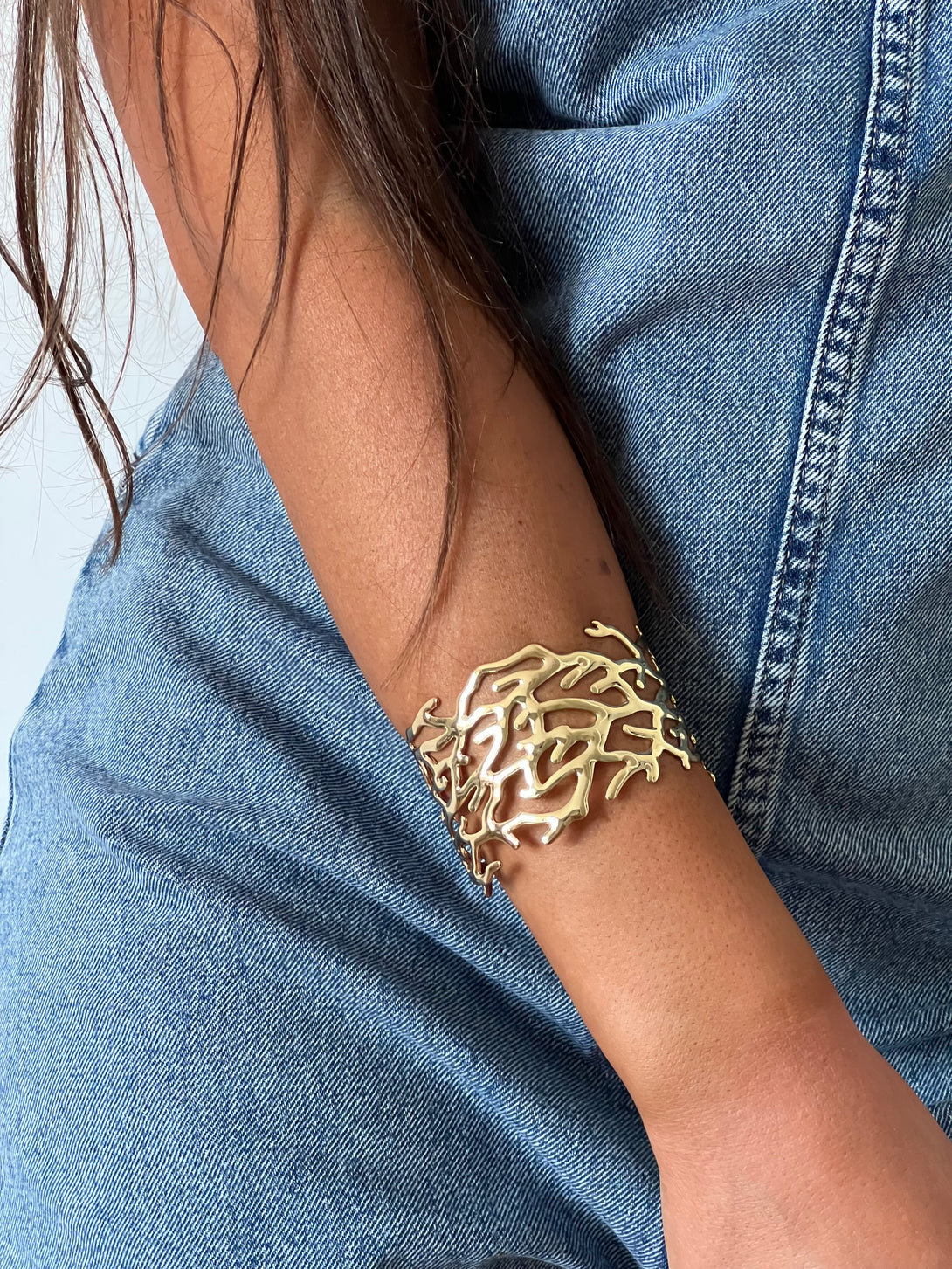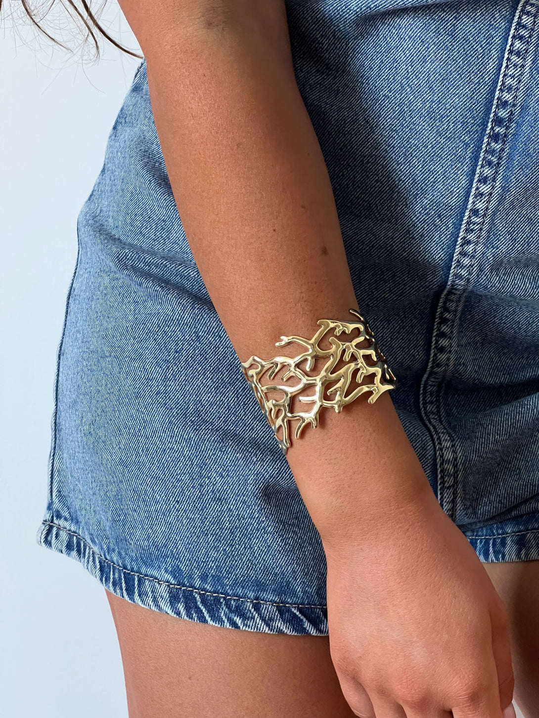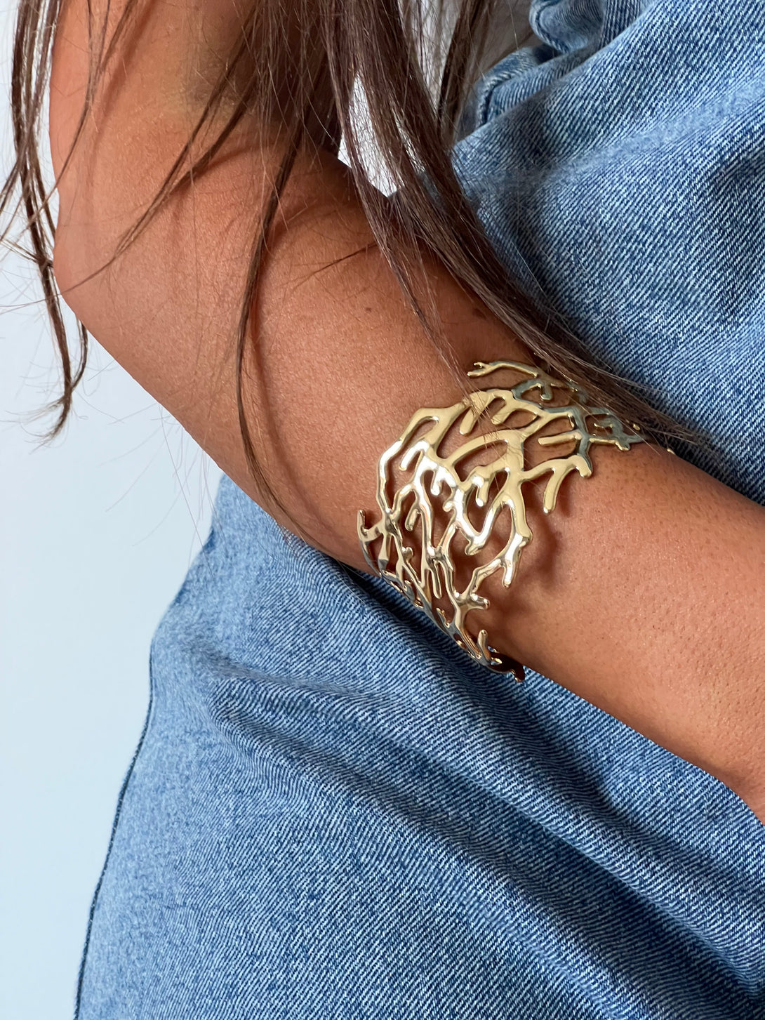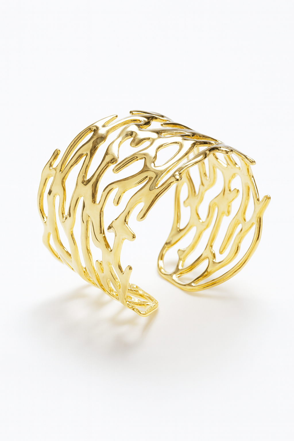 Bratara Coral Twist aduce un omagiu frumusetii naturii prin designul inspirat de formele ramificate ale coralilor marini. Realizata din otel inoxidabil auriu, piesa imbina stilul contemporan cu un aer organic si fluid. Textura decupata o face usoara si confortabila, potrivita atat pentru tinutele de vara, cat si pentru outfituri statement de seara.