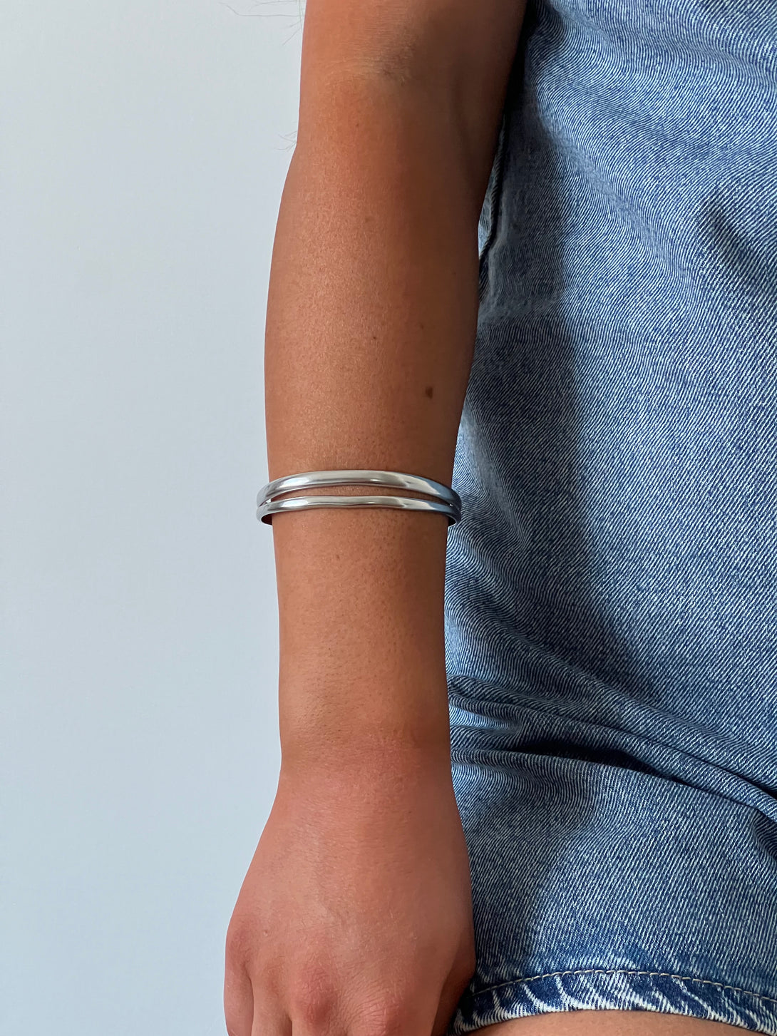 Bratara moderna cu design dublu, minimalist, din otel inoxidabil cu finisaj lucios argintiu. Cele doua benzi curbate creeaza un efect fluid si elegant pe incheietura, adaugand o nota rafinata oricarei tinute. Rezistenta la oxidare si zgarieturi, perfecta pentru purtare zilnica sau ocazii speciale.