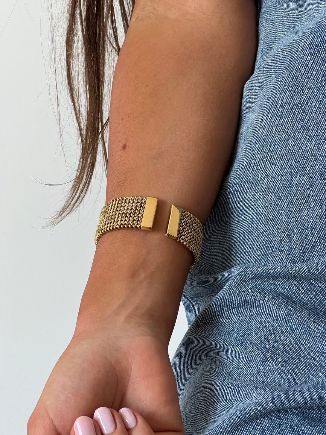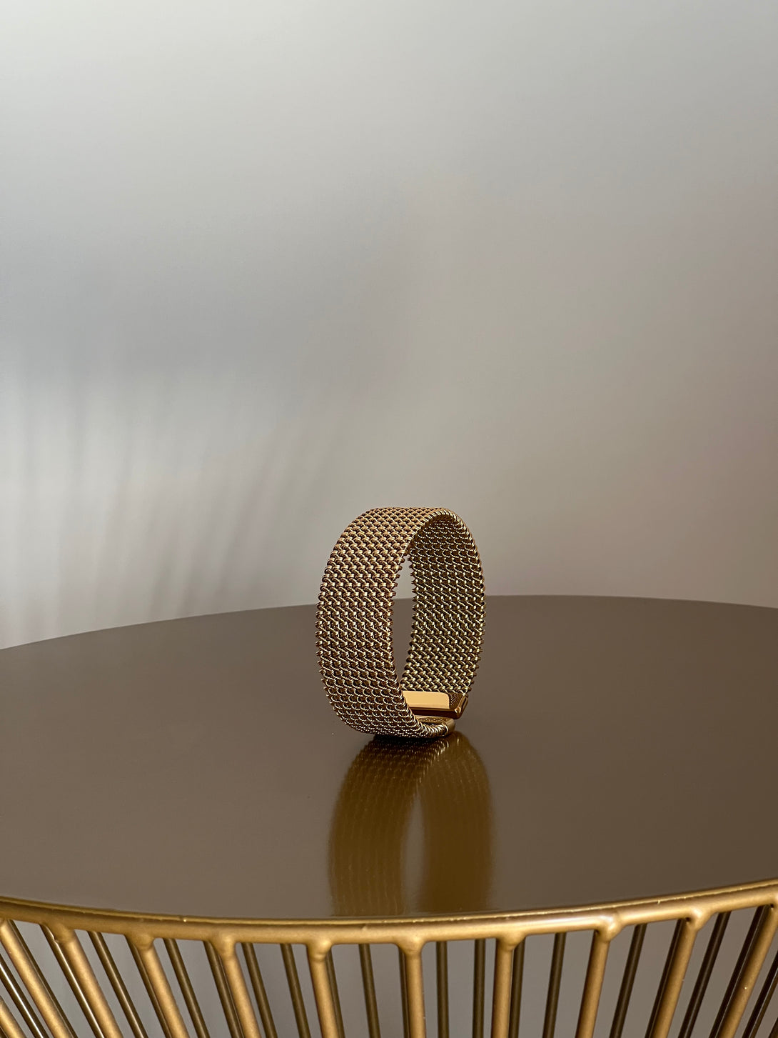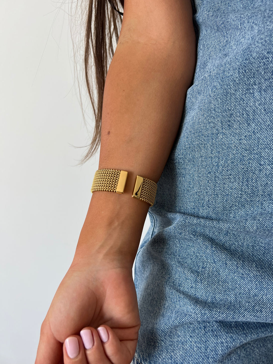 Bratara Gold Mesh combină eleganța cu textură sofisticată, având un design tip plasă metalică din oțel inoxidabil placat cu aur. Finisajul mat‑lucios și împletitura fină creează un efect vizual rafinat, iar marginea rigidă, deschisă, asigură o potrivire confortabilă și ajustabilă pe încheietură. Este hipoalergenică, rezistentă la apă și nu se decolorează în timp. Ideală pentru tinute office, urbane sau elegante de seară.