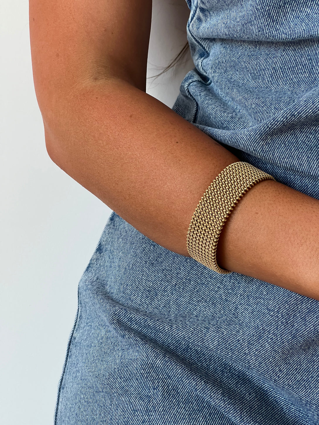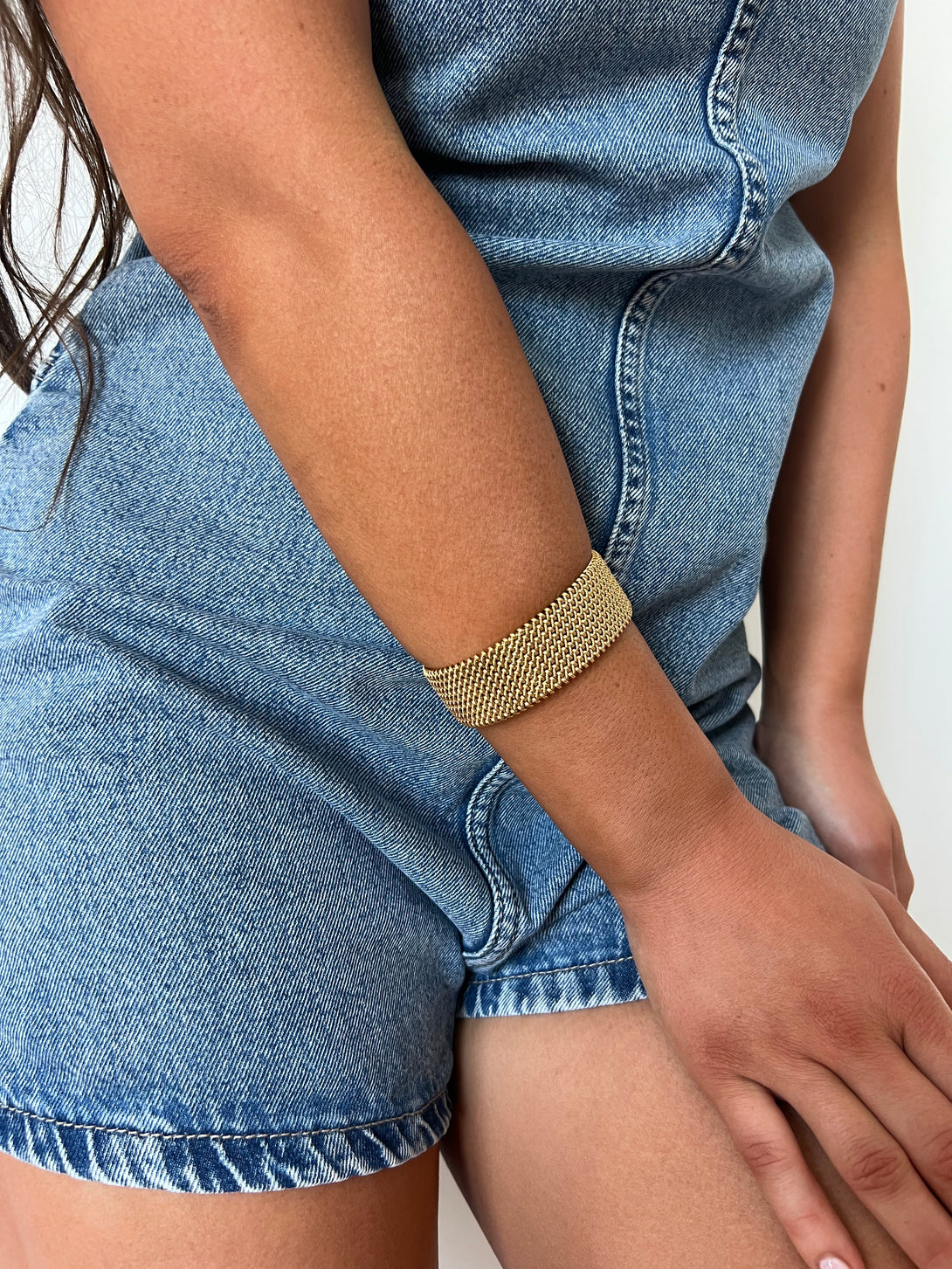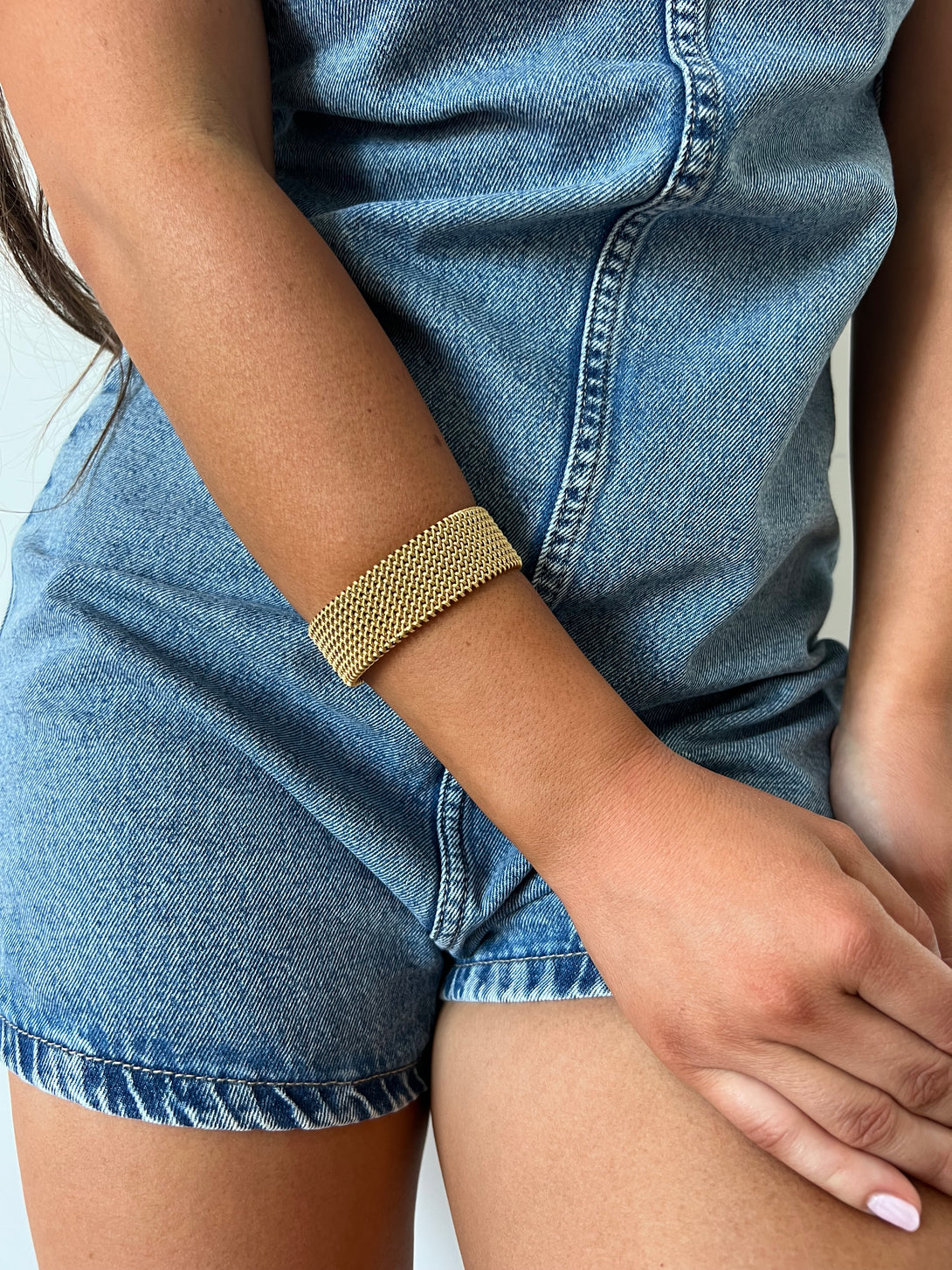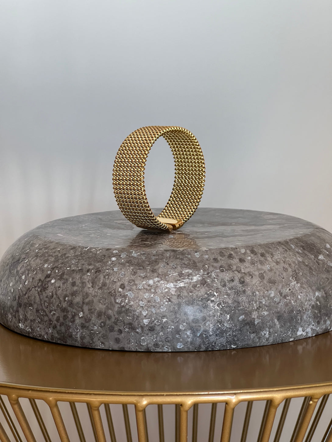 Bratara Gold Mesh combină eleganța cu textură sofisticată, având un design tip plasă metalică din oțel inoxidabil placat cu aur. Finisajul mat‑lucios și împletitura fină creează un efect vizual rafinat, iar marginea rigidă, deschisă, asigură o potrivire confortabilă și ajustabilă pe încheietură. Este hipoalergenică, rezistentă la apă și nu se decolorează în timp. Ideală pentru tinute office, urbane sau elegante de seară.
