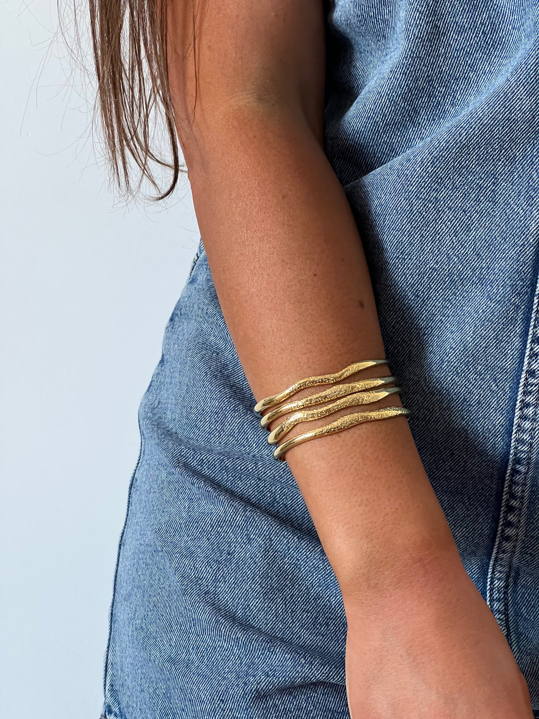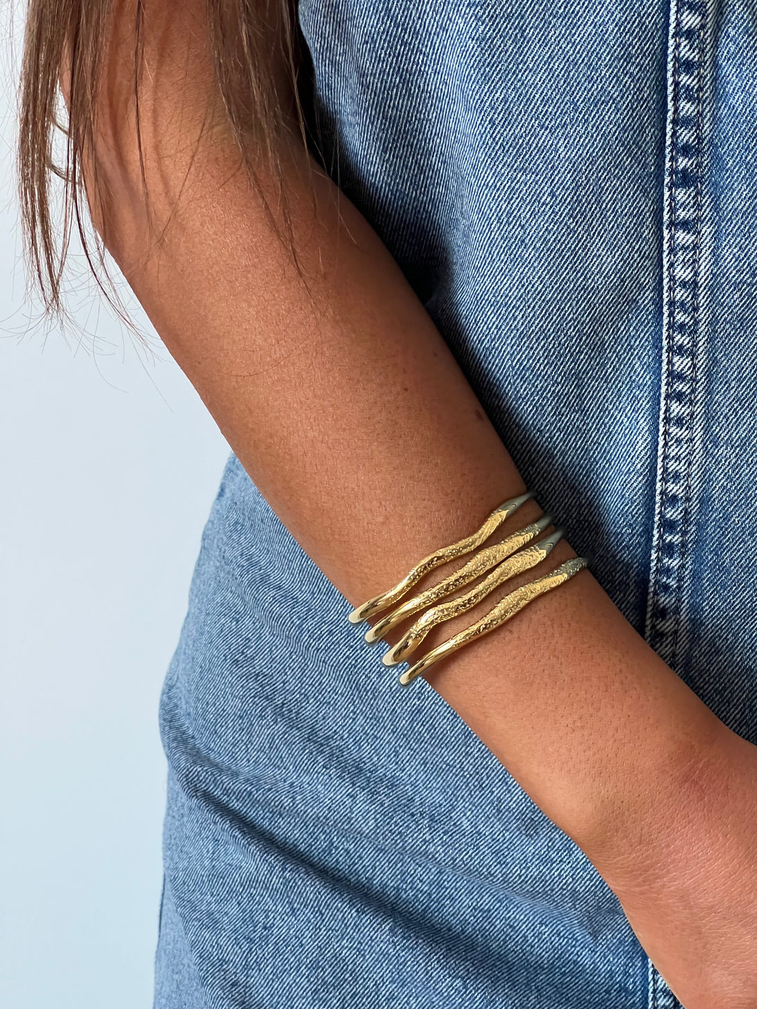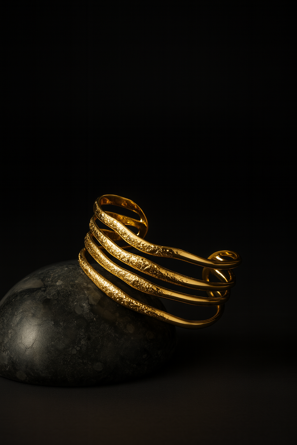 Bratara Gold Quad Wave este o piesa statement, realizata din otel inoxidabil placat cu aur, compusa din patru benzi subtiri unite într‑un design fluid şi ondulat. Textura ciocănită şi finisajul lucios reflectă lumina din orice unghi, creând un efect vizual spectaculos. Bratara este hipoalergenică, rezistentă la apă şi nu se decolorează, iar sistemul deschis permite ajustarea uşoară pe orice încheietură.