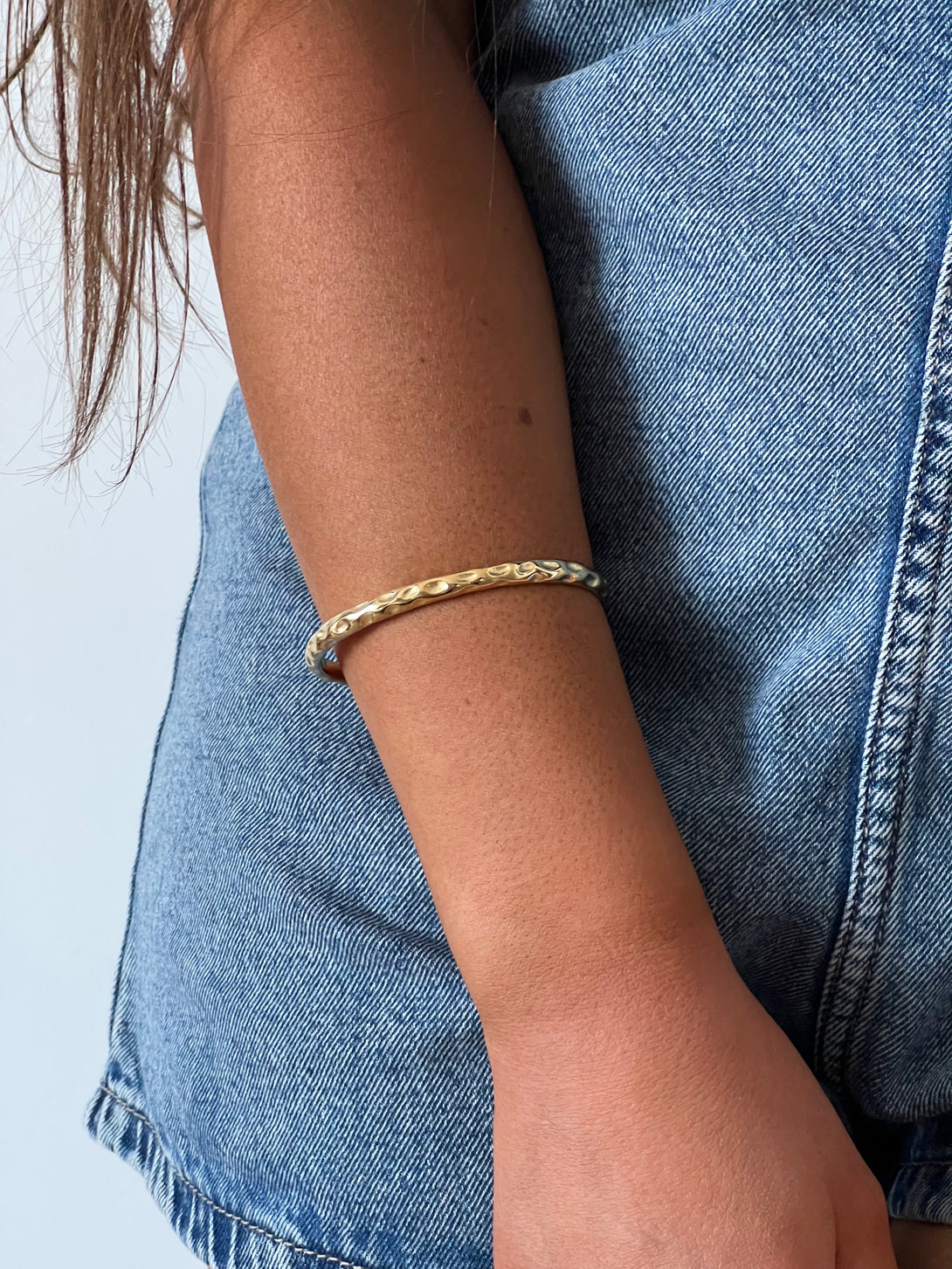 Bratara Jungle Slim este realizata din otel inoxidabil premium cu finisaj auriu si textura martelata, un material hipoalergenic, rezistent la apa si la uzura zilnica, care nu se innegreste si nu rugineste. Designul sau subtire, dar plin de caracter, evoca energia naturii salbatice si aduce un plus de stil oricarei tinute. Ideala pentru a fi purtata singura sau in combinatie cu alte bratari. Produsul beneficiaza de garantie inclusa