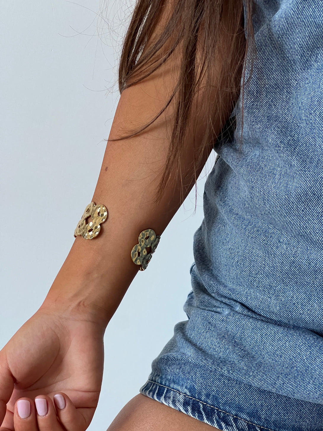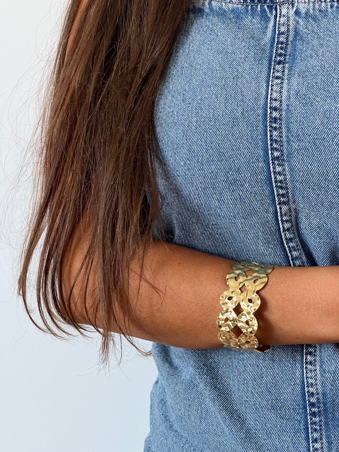 Bratara Lace Gold este realizata din otel inoxidabil premium cu finisaj auriu, un material hipoalergenic, rezistent la apa si la uzura zilnica, care nu se innegreste si nu rugineste. Designul sau decupat cu textura martelata aminteste de dantela, oferind un aer elegant si feminin, ideal pentru a accesoriza tinutele de zi sau de seara. Produsul beneficiaza de garantie