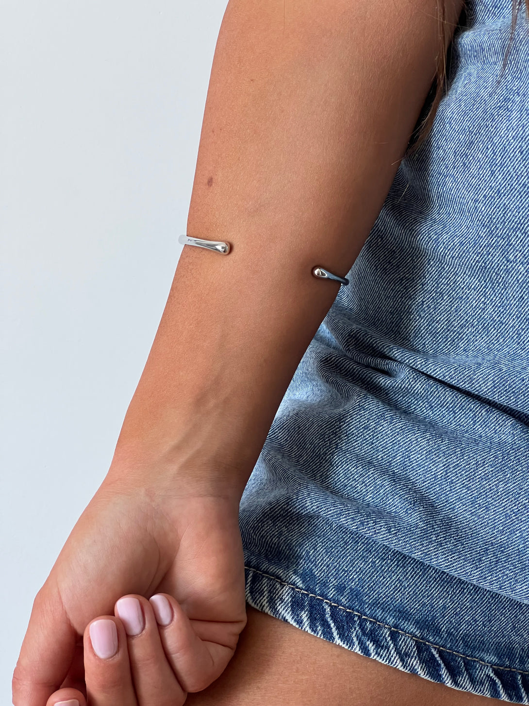 Bratara rigida cu un design organic, inspirat de curbele naturale ale unei crengi, cu finisaj argintiu lucios. Este realizata din otel inoxidabil, un material durabil, hipoalergenic si rezistent la apa. Forma deschisa o face usor de ajustat pe orice incheietura. Un accesoriu minimalist, dar elegant, ideal pentru purtare zilnica sau pentru a completa o tinuta moderna.