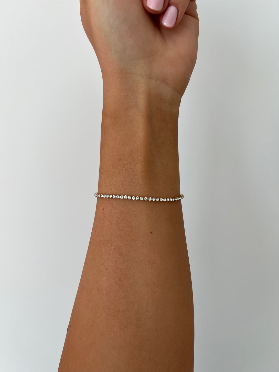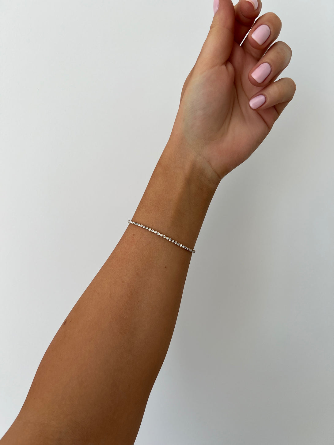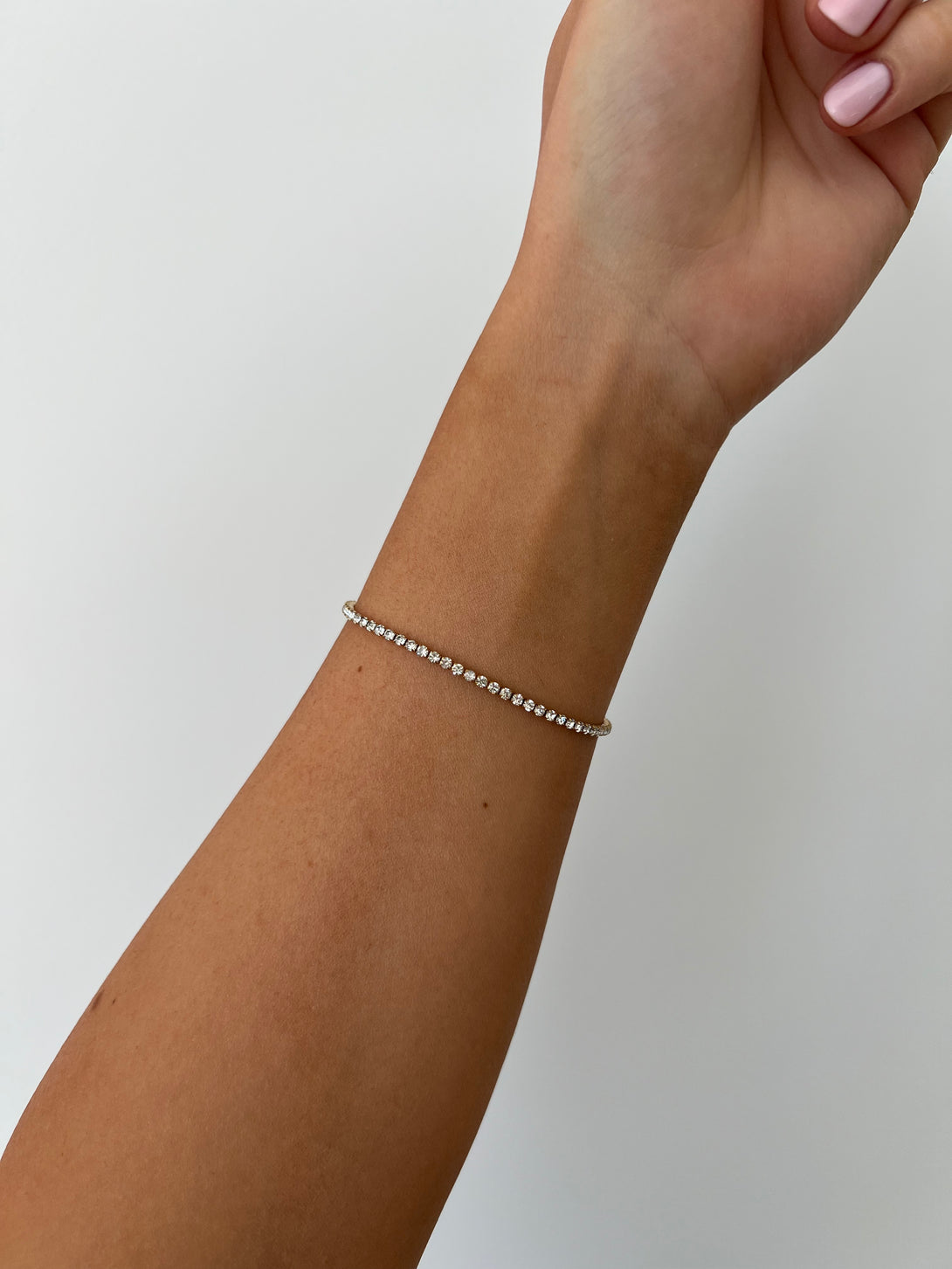 Bratara Tennis Gold este definita de un sir elegant de cristale albe perfect aliniate, care ofera o stralucire rafinata si continua pe incheietura. Montata pe o baza delicata din otel inoxidabil placat cu auriu, bratara este ajustabila si se inchide cu o zala sigura. Este alegerea ideala pentru tinutele elegante sau pentru un accent glam in look-urile de zi cu zi.