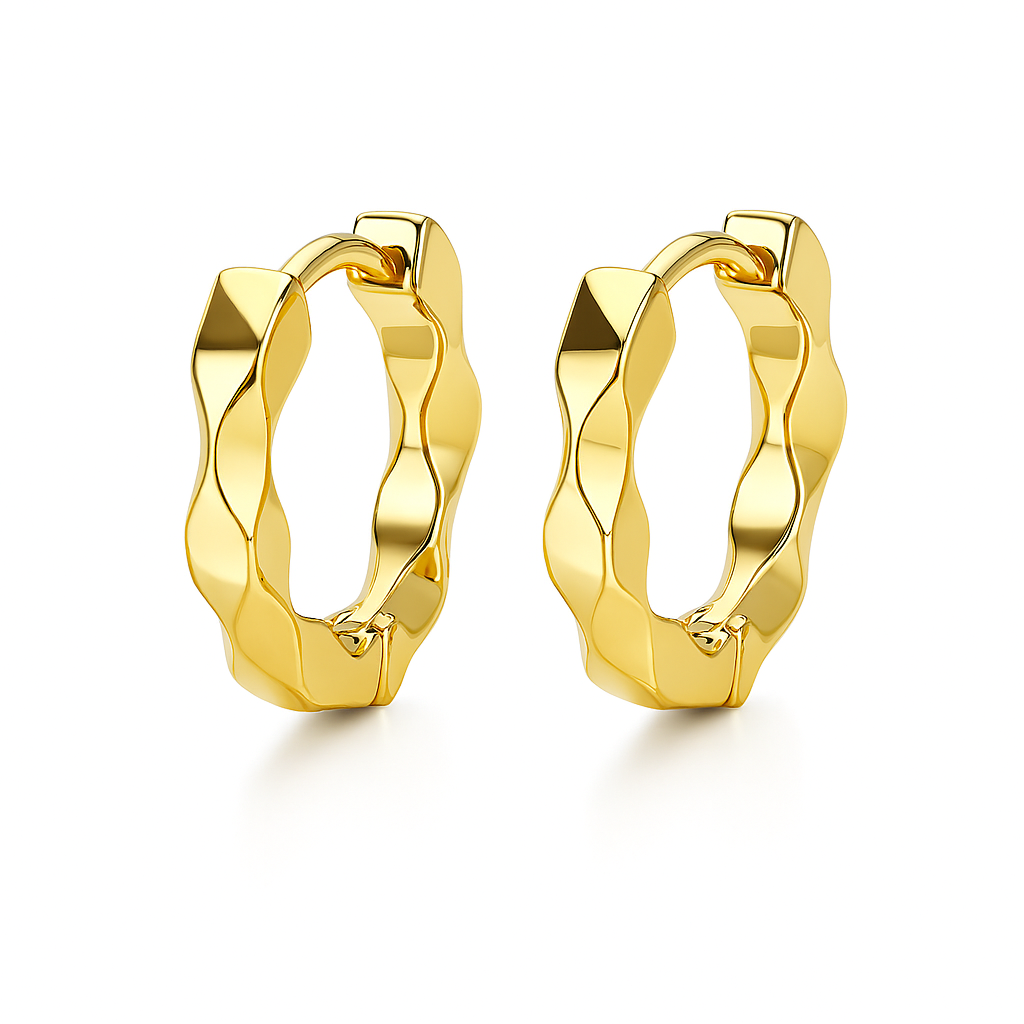 Cercei tip hoop cu design ondulat si textura lucioasa, ce reflecta lumina pentru un efect elegant si sofisticat. Realizati din otel inoxidabil placat auriu, sunt rezistenti la apa, hipoalergenici si ideali pentru uz zilnic sau tinute speciale. Sistemul de prindere cu inchidere sigura ii face usor de purtat.