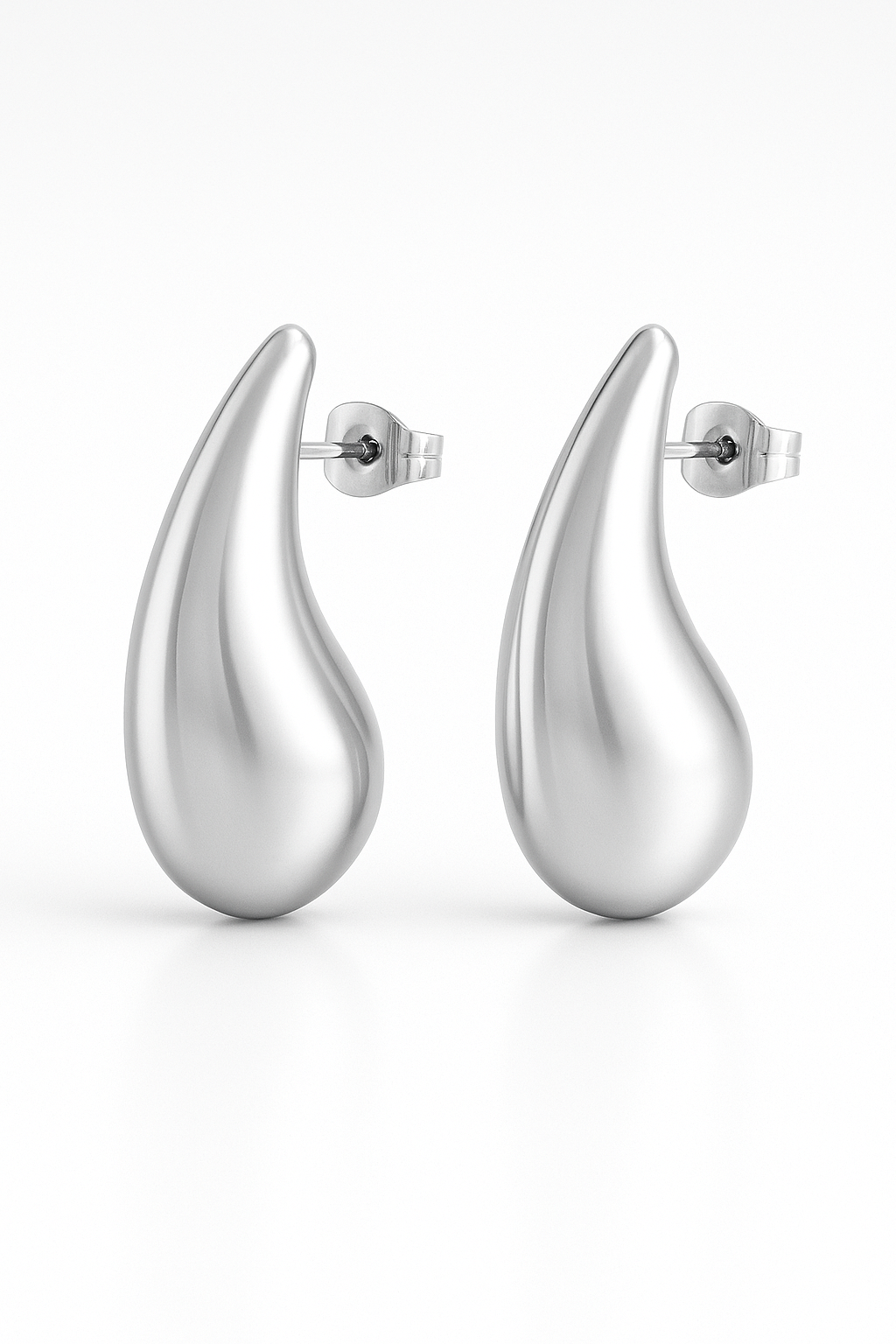 Cercei stud argintii din otel inoxidabil, cu un design fluid si elegant in forma de picatura. Aceasta varianta medie (2.6 cm x 1.4 cm) ofera un echilibru perfect intre subtil si expresiv. Finisajul lucios si forma curbata le confera un aspect sofisticat, potrivit atat pentru tinutele de zi cu zi, cat si pentru ocazii speciale.