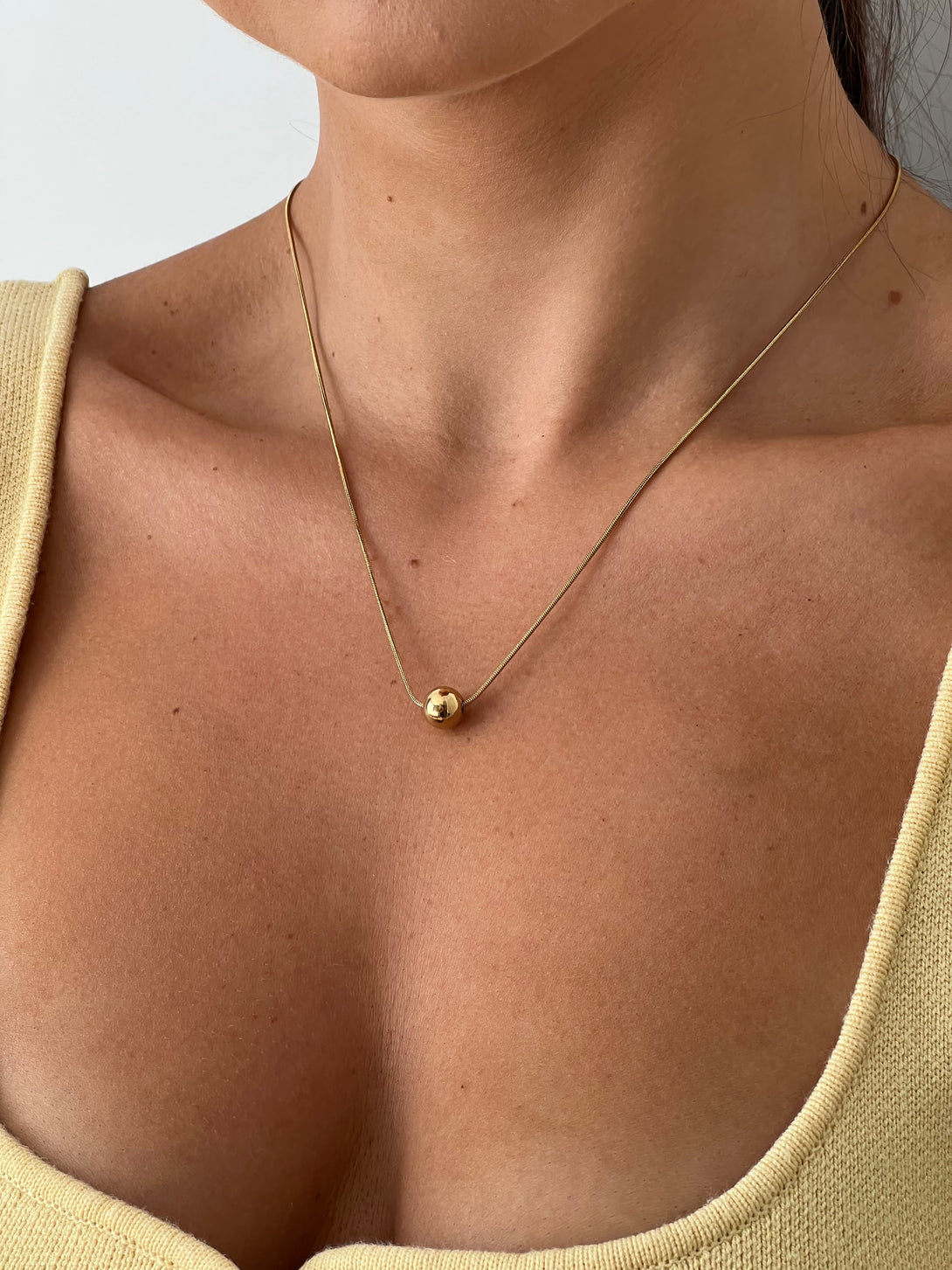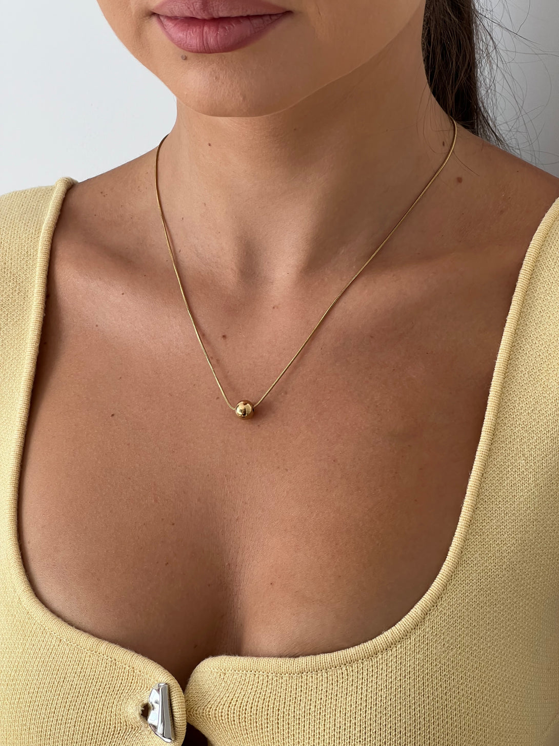 Colierul Gold Sphere se remarcă prin simplitate şi eleganţă, având un pandantiv sub formă de bilă perfect rotundă fixată pe un lanţ tip şarpe din otel inoxidabil placat cu aur. Este hipoalergenic, rezistent la apă și nu se decolorează, ideal pentru purtare zilnică sau pentru un accent discret la o ţinută de seară. Lungimea lanţului este ajustabilă pentru confort maxim.