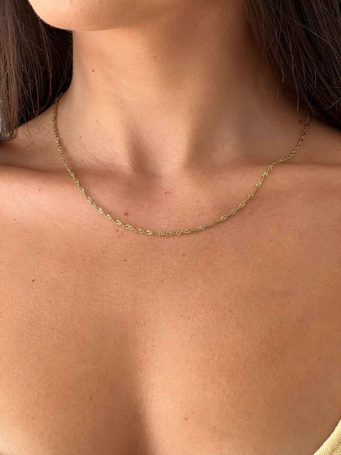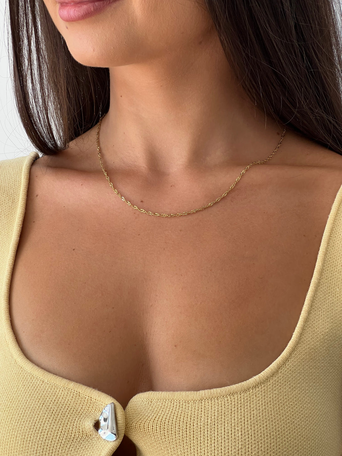 Colierul Twisted Gold este definit de simplitatea sa eleganta si de textura rasucita care reflecta delicat lumina. Este o piesa de baza in colectia oricarei femei – subtil, rafinat si usor de asortat atat cu alte bijuterii, cat si purtat individual.