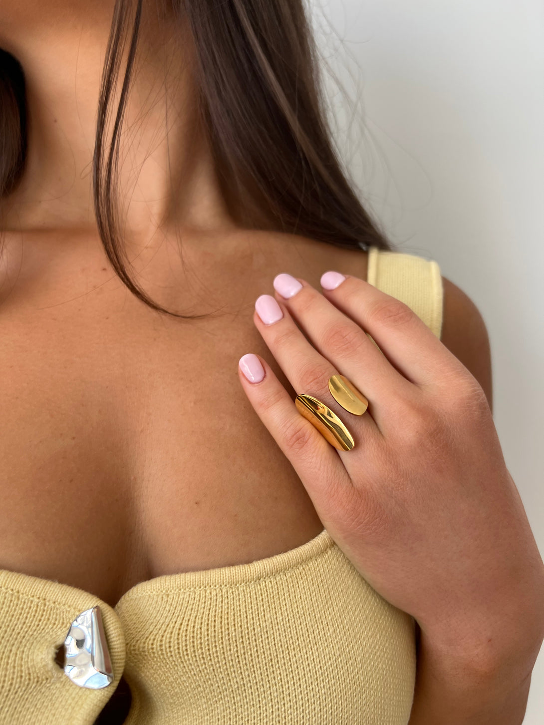 Un inel statement cu un design curgator si modern, ce imbina formele asimetrice cu un finisaj lucios pentru un efect sculptural remarcabil. Ideal pentru un look urban sofisticat sau minimalist. Fabricat din otel inoxidabil placat auriu, rezistent la apa, zgarieturi si uzura zilnica. Marime ajustabila, potrivita pentru orice deget.