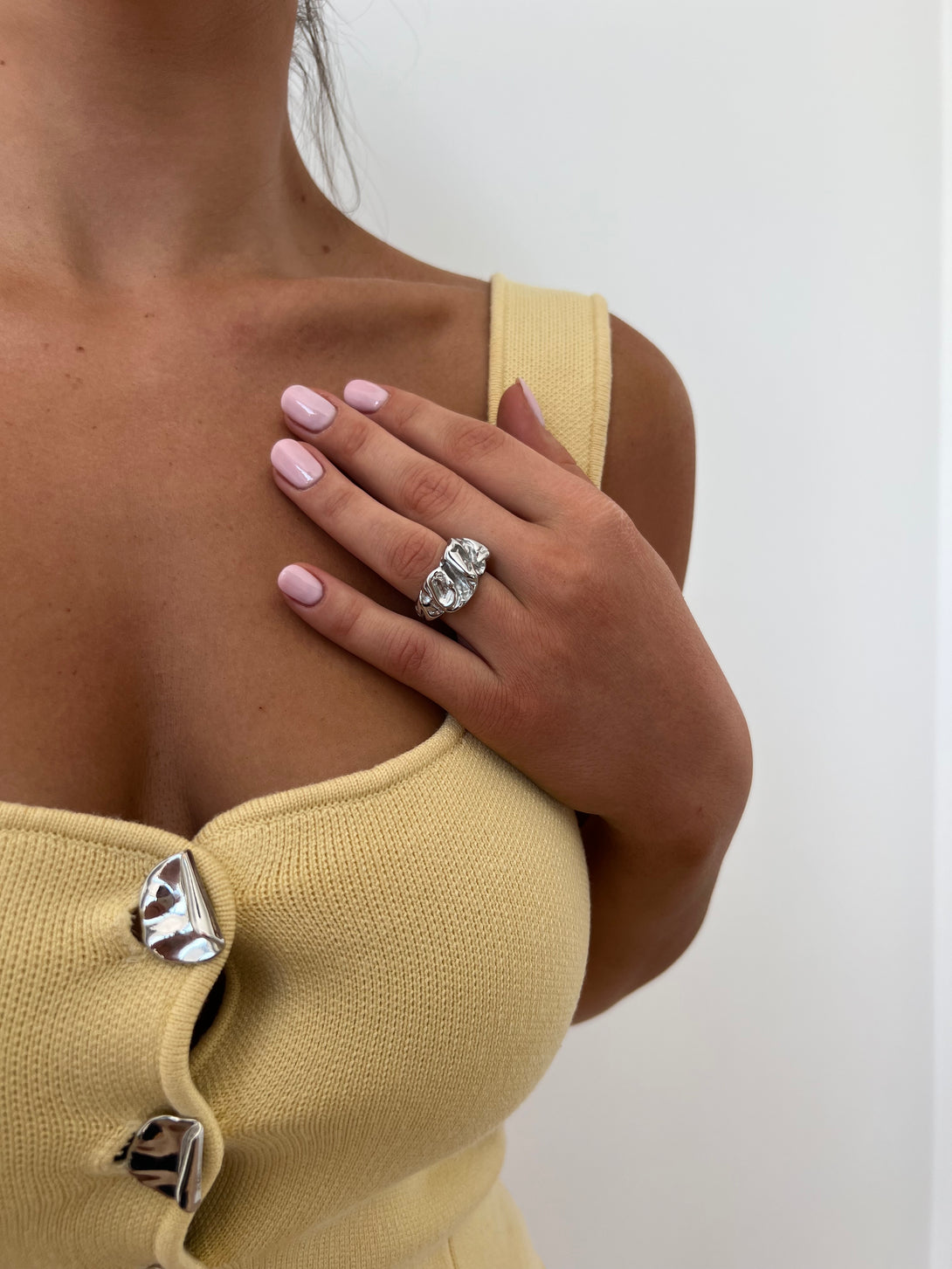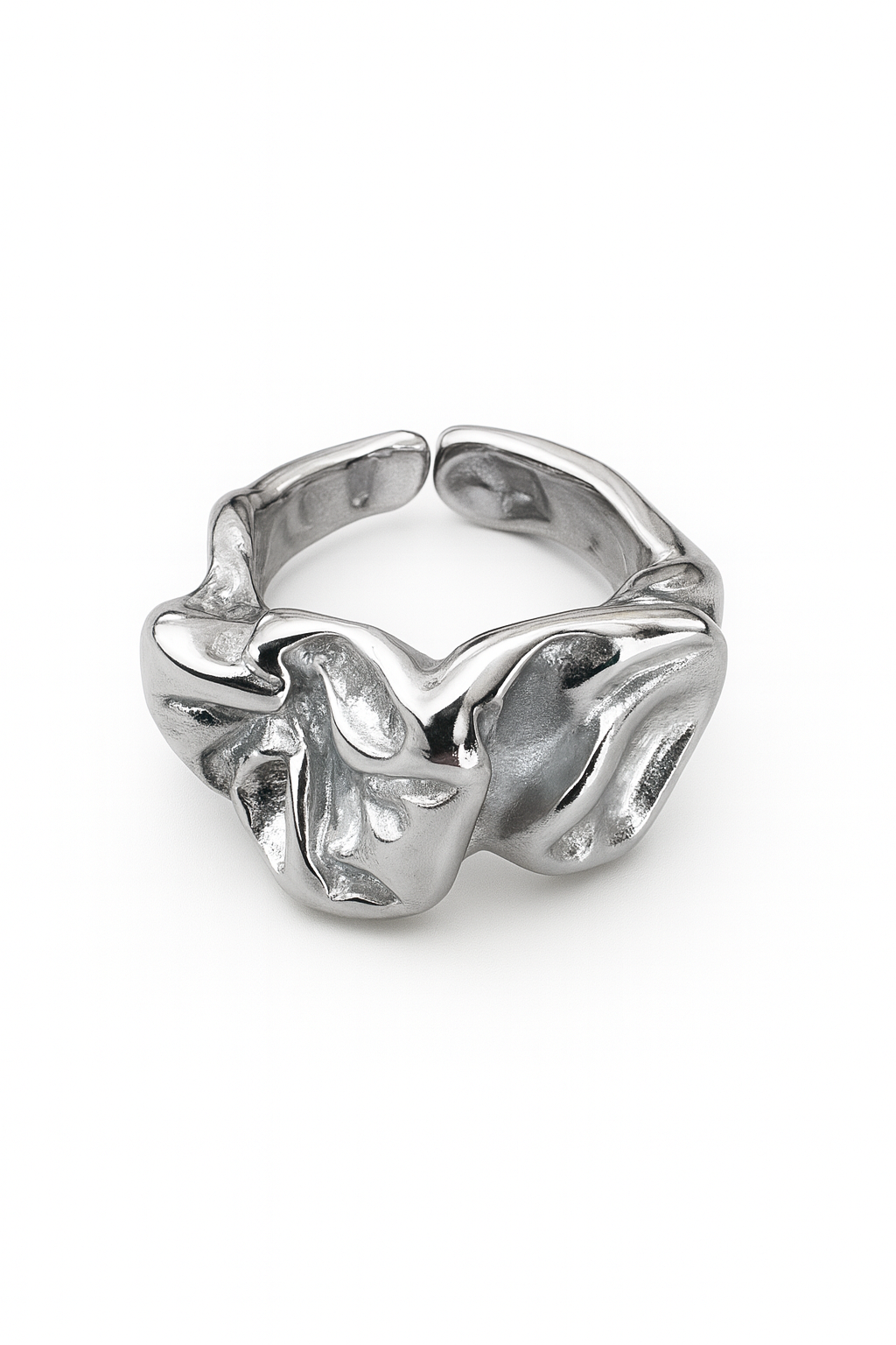 Inel reglabil cu design artistic de tip "molten", inspirat din forme organice topite, care confera un look avangardist si modern. Realizat din otel inoxidabil cu finisaj argintiu lucios, rezistent la apa si hipoalergenic, potrivit pentru purtare zilnica sau tinute statement.