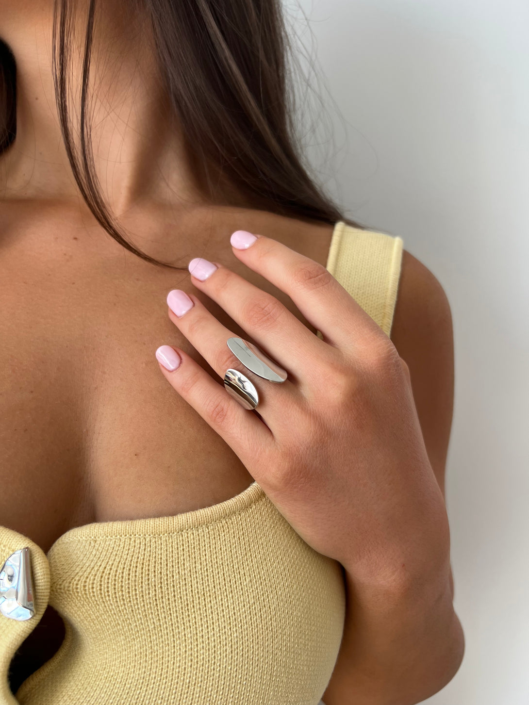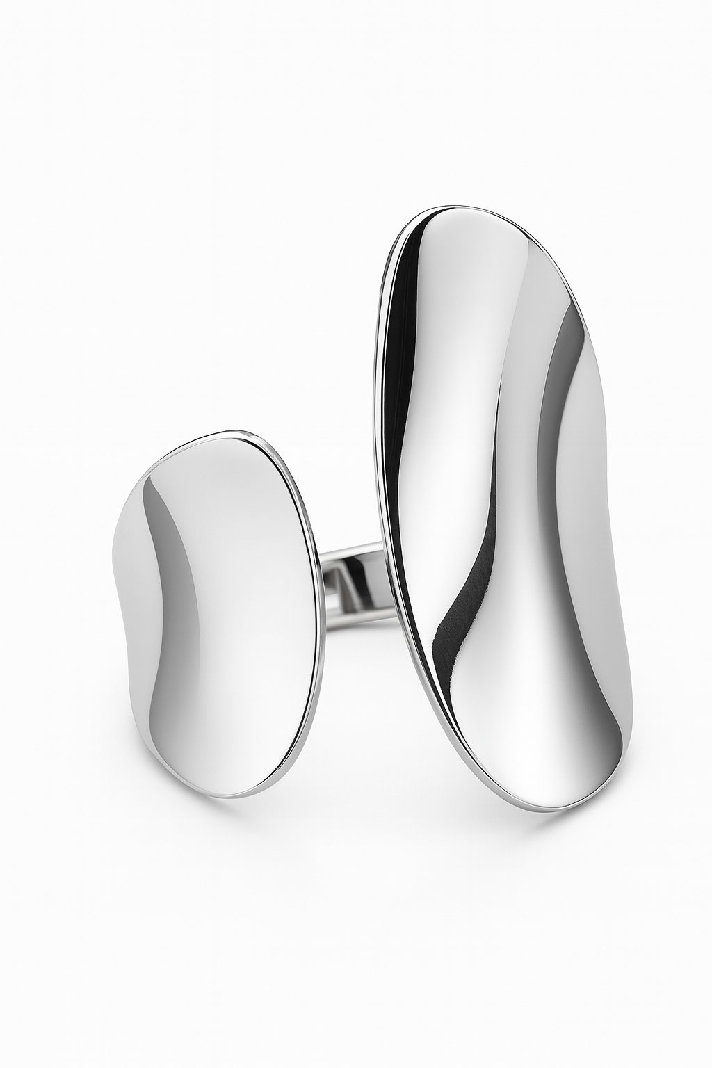 Un inel statement cu un design curgator si modern, ce imbina formele asimetrice cu un finisaj lucios pentru un efect sculptural remarcabil. Ideal pentru un look urban sofisticat sau minimalist. Fabricat din otel inoxidabil argintiu, rezistent la apa, zgarieturi si uzura zilnica. Marime ajustabila, potrivita pentru orice deget.