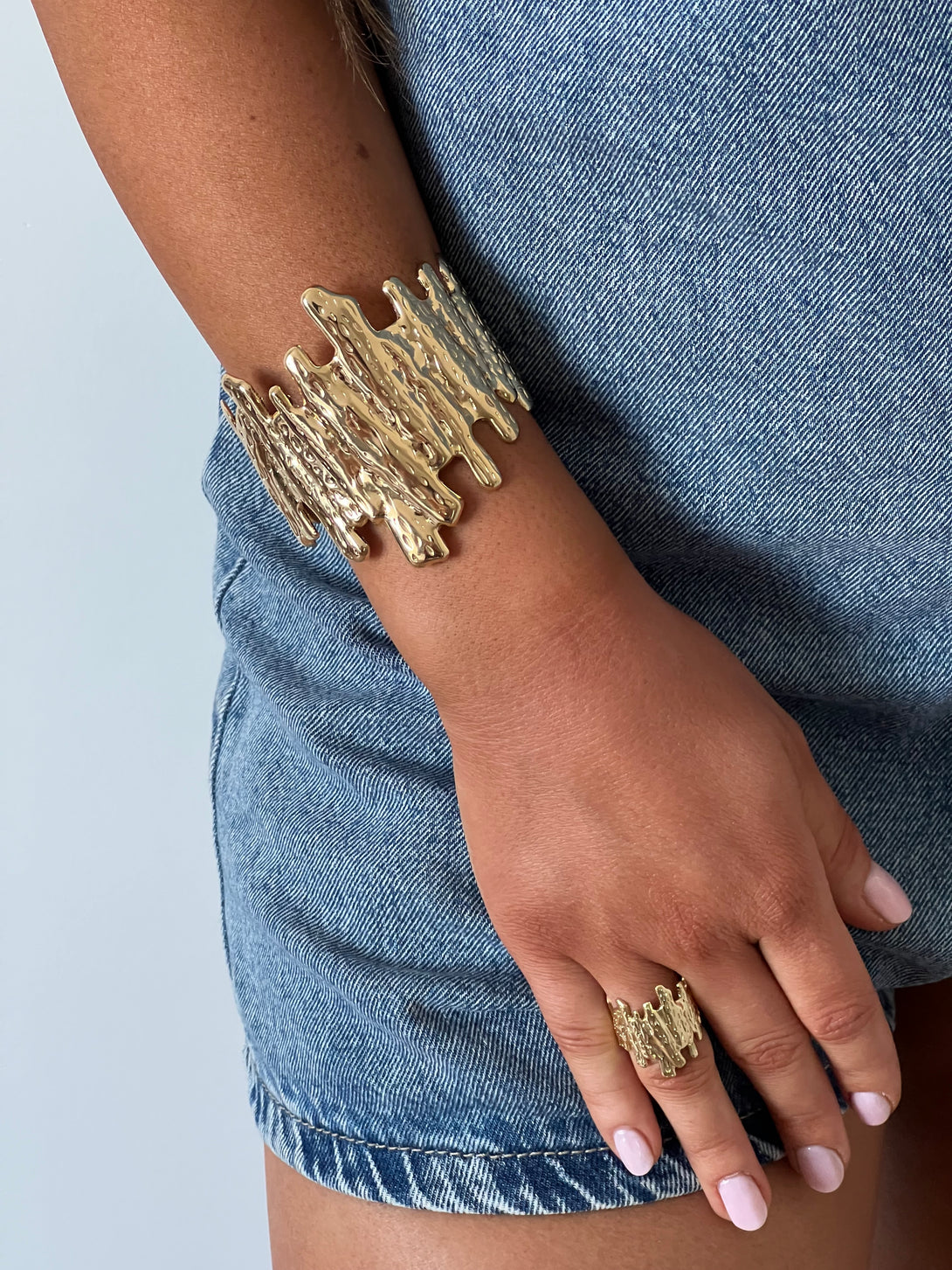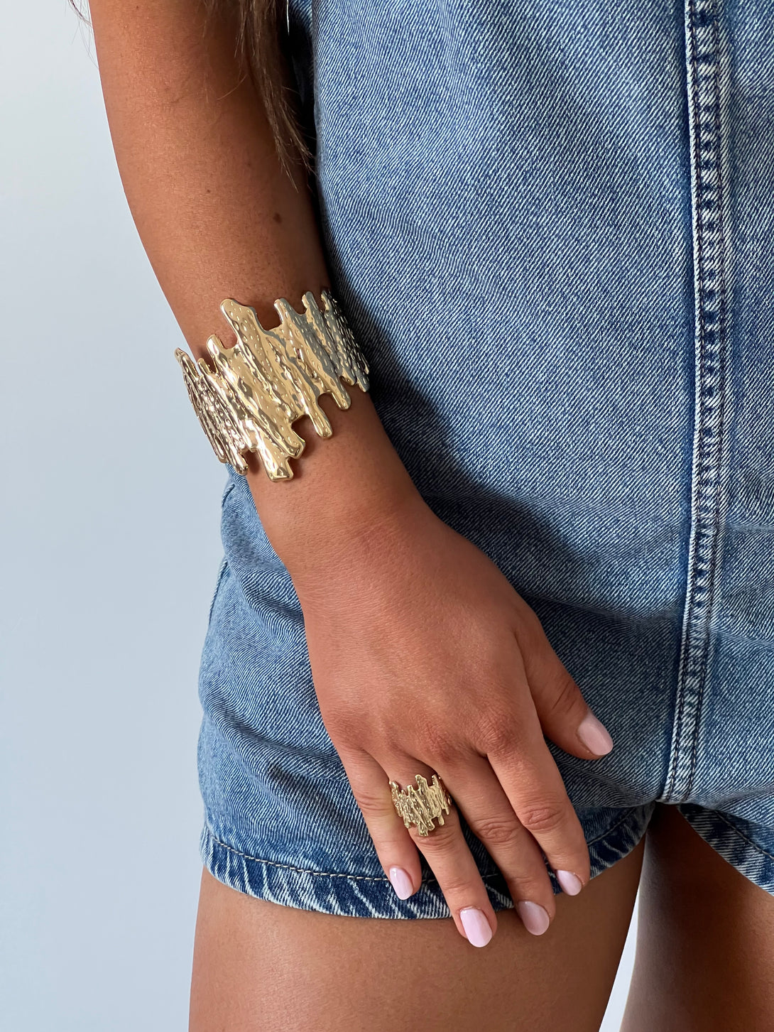 Setul Gold Wave imbina armonios eleganta cu expresivitatea. Designul sculptural si textura organica transforma acest set intr-o adevarata piesa de arta purtabila. Compus dintr-o bratara statement si un inel asortat, setul adauga impact vizual oricarei tinute.
